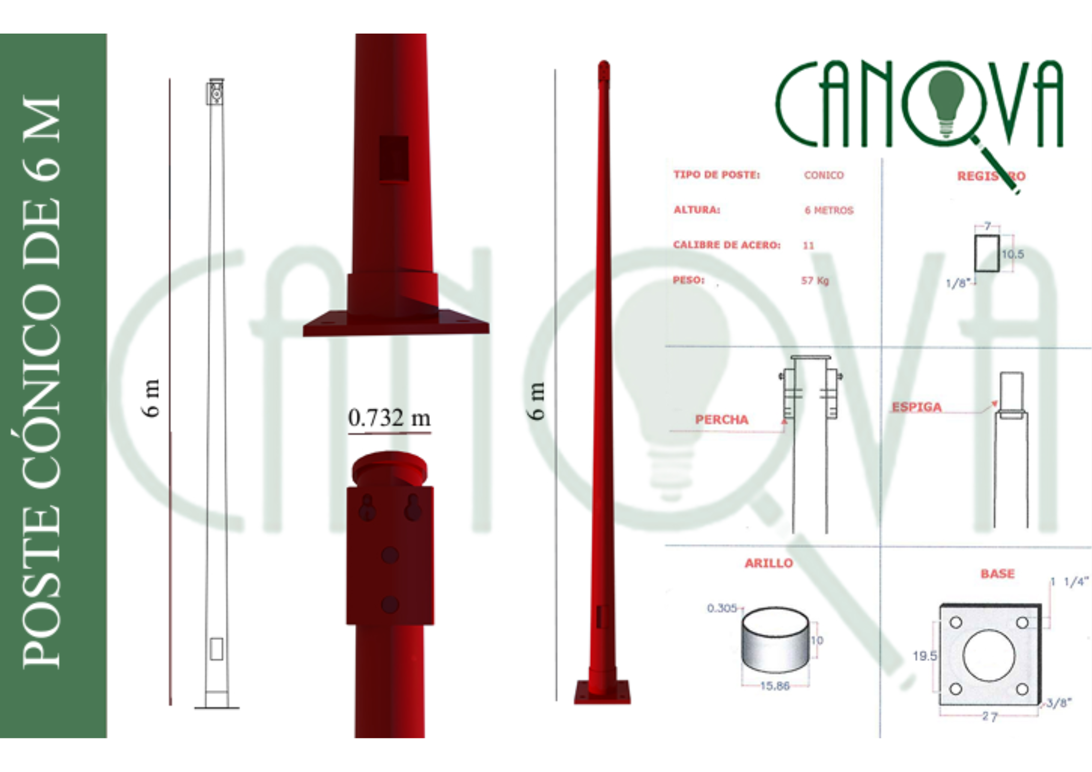 – **Altura Ideal:** Con 6 metros de altura, este poste es perfecto para la instalación de luminarias, señalización vial, o estructuras de soporte en espacios abiertos.